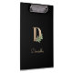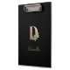 Die elegante schwarze Zwischenablage verfügt über ein goldenes botanisches Monogramm in der Mitte.