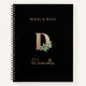 Elegantes schwarzes Notebook mit einem goldenen botanischen Monogramm in der Mitte.