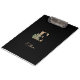 Die elegante schwarze Zwischenablage verfügt über ein goldenes botanisches Monogramm in der Mitte.