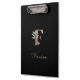 Die elegante schwarze Zwischenablage verfügt über ein goldenes botanisches Monogramm in der Mitte.