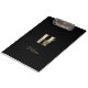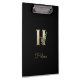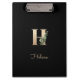 Die elegante schwarze Zwischenablage verfügt über ein goldenes botanisches Monogramm in der Mitte.