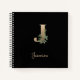 Elegantes schwarzes Notebook mit einem goldenen botanischen Monogramm in der Mitte.