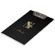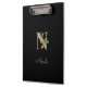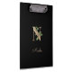 Die elegante schwarze Zwischenablage verfügt über ein goldenes botanisches Monogramm in der Mitte.