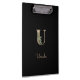 Die elegante schwarze Zwischenablage verfügt über ein goldenes botanisches Monogramm in der Mitte.