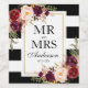 Elegantes Watercolor Burgundy Marsala Blauer Blütenschwarz und weiß gestreifter Goldrahmen Wein und Sekt Flaschen Etiketten