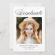 Elegante Abschluss-Ankündigung mit "Graduate" oben in einem schwarzen Kalligraphieskript angezeigt. Das Design zeigt das Foto des Absolventen mit dem Namen des Absolventen, dem Schulnamen und dem Abschluss Jahr, wie unten gezeigt. Die Ankündigung des Foto Abschlusses kehrt zurück, um optionalen Text wie z.B. künftige Pläne, Graduierungsparty-Details usw. anzuzeigen. Die schicke Ankündigung des Abschlusses ist ideal, um den Abschluss von Absolventen der Oberstufe und der Uni anzukündigen.