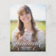 Diese elegante Abschluss-Postkarte besticht durch hübsche weiße Kalligraphie und ein großes Foto. Das weiße Schriftzeichen am unteren Rand liest "Graduate" in Kleinbuchstaben, die mit eleganten Schnörkeln geschmückt sind. Fügen Sie den Namen des Absolventen und das Jahr des Abschlusses an die Vorderseite unter dem Typografie-Design. Auf der Rückseite der Abiturpostkarte können Sie eine Nachricht an Empfänger und/oder Graduiertengruppe Informationen hinzufügen.