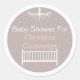 Eleganter Chandelier Baby Shower Classic Round Sticker . Diese bezaubernden Babyduschaufkleber feiern ein kleines Mädchen mit einem hellrosa, weißen und braunen Hintergrund, das mit einem weißen Krippchen und einem Kronleuchter geschmückt ist.