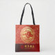 Ein elegantes visuelle einer Schlange in Rot mit Blüten zu einem Kreis (inspiriert durch traditionelle chinesische Papierschnitt) mit goldenem Kreis überlagert ein rotes und gelbes traditionelles asiatisches Muster + grafische "GLÜCKLICHES NEUES JAHR" in Chinesisch und Englisch und alte chinesische Kalligraphie für "Schlange" auf gradientenem rotem Band. Design auf der komplett bedruckten Tasche.