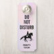 Ein Türhänger mit schwarz-weißer Abbildung eines Dressurreiters. Das Pferd und der Reiter sind eine Pirouette darstellend. Klug und schön. Set auf einem Aquarellboden in zarten und gedämpften Pastellfarben. Im Text steht Nicht stören, mit einem personalisierten Namen.
