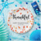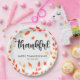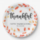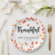 Elegante und moderne Erntedank-Papier-Teller mit Text, der "Dankbar" in Handschrift und Kalligraphie Stil Schriftart. Die Herbstlaube sind im Aquarellstil gehalten.