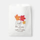 Die Themensäcke "Fall in Liebe" sind mit einem lebendigen Blätter aus Herbst-Ahorn und einem individuell anpassbaren Monogramm der Braut- und Bräutigam-Namen und des Hochzeitstages ausgestattet.