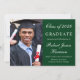 Einfache und moderne Ankündigung eines grünen Uni-Abschlusses mit einem Foto des Absolventen, seinem Namen und Klassenjahr in einem eleganten weißen Drehbuch und seiner Universität, Hauptfach und Ehren.