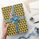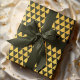 Klassisch elegante Weihnachtsgeschenkverpackung mit geometrischen Weihnachtsbaummustern in dunklem Piniengrün mit Imitaten, vergoldeten Folienprint. Perfektes dekoratives Geschenkpapier für all Ihre Urlaubsgeschenke.