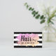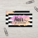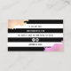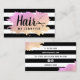 Moderne Visitenkarte mit schwarz-weiß Streifen, Gradienten Imitate Gold & lila Textur, Schere und elegante Kalligraphie Schriftart.