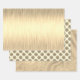 Drei verschiedene Arten von Goldblechen von Packpapier. Das erste ist ein glänzendes, ombre schattiertes goldenes Farbverlaufsmuster mit einem schönen goldenen Schimmer und das nächste ist dunkle, schmale goldene glitzernde Kreise auf einer bräunlichen Kulisse, das dritte ist der goldene Glitzer, der sich in einer bräunlichen Kulisse zum Kontrast befindet. Goldene festliche Chic-Villen