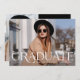 Moderne Abschluss-Ankündigung mit dem vollblutenden horizontalen Foto des Absolventen auf der Vorderseite mit "Graduate" in einem eleganten, weißen Texteüberlagerungsstück. Personalisieren Sie die Front der einfachen Abschluss Ankündigung mit dem Namen und Abschluss des Absolventen Jahr. Die Ankündigung kehrt zurück, um ein zusätzliches Foto mit Ihrer persönlichen Nachricht anzuzeigen. Die 2-Foto-Abschluss-Ankündigung eignet sich sowohl für Absolventen der Highschool als auch für Absolventen der Uni.