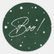 Ein elegantes, modernes "Boo"! Halloween-Aufkleber/Umschlag Aufkleber mit weißem handgeschriebenem Drehbuch und verstreuten Sternen vor einem leicht bedrückten grünen Hintergrund. Funktioniert mit runden oder quadratischen Aufklebern. Erhältlich in anderen Farben und zur Abstimmung von Einladungen und Zubehör.
