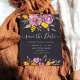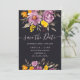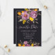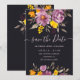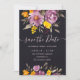 Eleganter Herbst Winter lila blumengeschichten Hochzeit speichern das Datum mit einer modernen und eleganten Kalligraphie die Hochzeit von Script in lila, orangen und gelben Blumen mit Salbei grün Blattwerk auf dunkelschwarz.