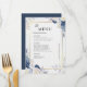 Eleganter Hochzeitstisch in Blau und Gold Menükarte