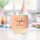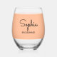 Stilloses, stylisches Weinglas für eine Brautjungfrau mit elegantem, minimalistischem Design auf hübschem pfirsichfarbenem Hintergrund. Personalisieren Sie Ihre Bestellung mit dem Namen der Brautjungfrau, der in einer stilvollen Schriftzeichen-Typografie angezeigt wird.