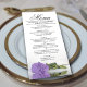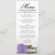 Dieses schöne Menü wird Ihrem Hochzeitsempfang etwas mehr Stil verleihen. Es zeichnet sich durch ein wunderschönes und romantisches Design aus, mit einer lila oder lavendelfarbenen Rose, die in einem Wasserbecken mit Wellen und Wellen reflektiert wird. Es gibt Platz für die Namen des Paares und das Hochzeitstag, und der Text ist vollständig anpassbar.