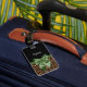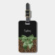 Reise auf Mode mit diesem stilvollen braunen Pelzleopard-Druck-Gepäckanhänger mit einem eleganten Olivgrünband gebunden in einen schicken Bogen. Personifizieren Sie diesen modernen und noblen Tierdruckentwurf, indem Sie Ihren Namen addieren. Ebenedruckbild, nicht tatsächlicher Pelz oder Band.