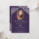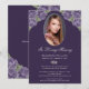 Elegante lila und silberne blumengeschmückte Gottesdienstankündigung/Begräbniseinladung mit Aquarellfarben-lila Rose und Baby's Atem-Blume vor einem dunklen lila Hintergrund. Personalisieren Sie diese Karte ganz einfach mit einem Foto Ihrer Lieben und den Details zur Gedenkstätte/Beerdigung.