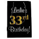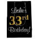 Dieses stilvolle, elegante und luxuriöse Geschenktütendesign mit Geburtstagsgeschenk weist die Ordnungsnummer "33." auf, die ein mit Gold inspiriert Farbverlaufsmuster von Imitation/Imitaten aufweist, sowie eine Geburtstagsgrüßbotschaft und einen benutzerdefinierten Empfängernamen in einem skriptartigen Schriftart. Es hat auch einen schwarzen Hintergrund. Eine Geburtstagsgeschenktüte wie diese könnte eine lustige Art sein, ein Geschenk oder Geschenk zu verpacken, das zur Feier von jemandes 33. Geburtstag gegeben wird. [~Z0000513]