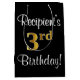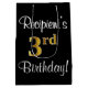 Dieses raffinierte, elegante und stilvolle Geschenktütendesign mit Geburtstagsdesign weist die Ordnungsnummer "3." auf, die ein großes, vergoldetes Farbverlaufsmuster von Imitation/Imitaten aufweist, sowie eine Geburtstagsgrüßbotschaft und einen personalisierten Empfängernamen in einem skriptartigen Schriftart. Es hat auch einen schwarzen Hintergrund. Eine stilvolle Geburtstagsgeschenktüte wie diese kann bei Geschenken oder Geschenken zum dritten Geburtstag von jemandem verwendet werden. [~Z0000513]