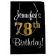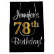 Dieses elegante, raffinierte und luxuriöse Geschenktütendesign mit Geburtstagsthema zeichnet sich durch die Ordnungsnummer "78." aus, die ein vergoldetes Gradientenmuster von Nachahmung/Imitat aufweist, sowie durch eine Geburtstagsgrüßbotschaft und einen benutzerdefinierten Empfängernamen in einem Schriftart im Skriptstil. Es hat auch einen schwarzen Hintergrund. Eine raffinierte Geschenktasche wie diese könnte eine lustige Art sein, ein Geburtstagsgeschenk oder Geschenk für jemanden zu verpacken, der seinen achtundsiebzigsten Geburtstag feiert. [~Z0000513]