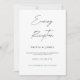 Feiern Sie Ihren besonderen Abend mit diesem eleganten und minimalistischen Empfang. Mit einem modernen Script-Schriftart und einem sauberen, zeitlosen Design ist diese Einladung perfekt für anspruchsvolle Hochzeitsfeiern. Einfach mit Ihren Daten anpassbar, sodass es eine stilvolle und unvergessliche Art ist, Ihre Gäste einzuladen. Ideal für zeitgenössische Hochzeiten in klassischer oder schwarzer Krawatte. Produktdetails: Vollständig anpassbarer Text Elegant-Script und Serif-Typografie Minimalistisch Schwarz-Weiß-Design Perfekt für Hochzeit-Abend-Empfang