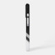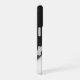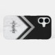 Dieses elegante, geometrische iPhone Gehäuse zeichnet sich durch einen individuell anpassbaren Namen und ein Monogramm aus weißem Marmor und silberfarbenem Rahmen auf schwarzem Hintergrund aus.