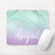 Dieses hübsche personalisierte Mauspad zeichnet sich durch Farbverlauf Imitate minzgrün Glitzer Marmorstruktur, lila Textur und eleganten Kalligraphie-Schriftart aus. Personalisieren Sie das Produkt mit Ihrem Namen oder einem anderen Text.