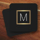 Untersetzer mit dem Monogramm-Initial in einem goldenen Farbverlauf (gedrucktes Bild, nicht echte Folie) auf schwarzem Hintergrund.