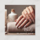 Mit unserer eleganten Nail Technician Salon Business Card stärken Sie Ihr Geschäft mit einem fesselnden Bild von den Händen einer Frau mit perfekt gepflegten Nägeln, die eine Kerze halten. Dieses raffinierte Design verlasse sicher einen bleibenden Eindruck bei potenziellen Kunden und zeigt Ihre Liebe zum Detail und die Hingabe zum Qualitätsservice. Mit dieser eleganten und beruflichen Visitenkarte heben Sie sich von der Konkurrenz ab, die Bände über Ihre Kompetenz in der Nagelpflege spricht. Erhöhen Sie Ihre Marke mit dieser atemberaubenden visuellen Darstellung des Bekenntnisses Ihres Salons zu Schönheit und Luxus.