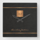 Luxuriöse elegante schwarze Leder Look Wanduhr mit einem goldenen Glitzer mit Monogramm Platz und personalisierte Namensmarke.