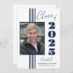 Klasse der 2025 stilvolle Abschluss-Ankündigung mit marineblau Streifen, Foto Rahmen und Text auf weißem Hintergrund.