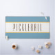 Dieses elegante, sportliche Design besticht durch einen weißen, horizontalen Streifen in der Mitte, der in hellgelb umrissen ist. Der PICKLEBALL-Text im mittleren Streifen kann personalisiert werden. Die Streifen im Hintergrund sind lebendig, mittelozeanblau.