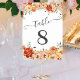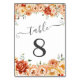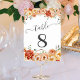Elegante Tischnummern mit Blume in Aquarelltönen in Orange, Rot, Gelb und Pfirsich, mit üppig grünen Blätter, die ein atemberaubendes Bouquet bilden. Ideal für Hochzeiten oder andere Veranstaltungen.