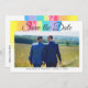 Schöne Regenbogen-Hochzeit Speichern Sie das Datum mit hübschen, künstlerischen Farbstrichen voll leuchtender Farbe über Ihrem LGBT Verlobung Foto. Diese farbenfrohen Karten sind perfekt für ein künstlerisches Paar oder eine schwule und lesbische Hochzeit. Fügen Sie Ihre Website dem QR-Code auf der Rückseite hinzu, um den Gästen den Link zu Ihrer Hochzeitswebsite zu geben.