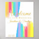 Schöne Regenbogen Hochzeitsfeier Goldfolie Begrüßungsschild mit hübschen, künstlerischen Farbzügen voll leuchtender Farbe. Diese farbenfrohe Dekoration ist ideal für ein künstlerisches Paar oder einen schwulen und lesbischen Empfang. Der fröhliche Aquarelldruck enthält kohlegrauen Text, der auf Willkommensfeier steht.