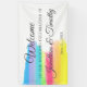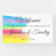 Schönes Regenbogen-Hochzeitsfest-Banner mit hübschen, künstlerischen Malstrichen voller heller Farbe. Diese farbenfrohe Dekoration ist ideal für ein künstlerisches Paar oder einen schwulen und lesbischen Empfang. Das fröhliche Aquarellzeichen enthält einen kohlegrauen Text, der auf Willkommensgrüßen bei unserer Hochzeit steht.
