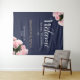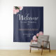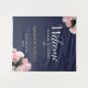 Eleganter rosa Rosen florale Hochzeit Begrüßung Hintergrund. Dieses moderne und elegante Begrüßungsschild mit Blumenzauber ist mit einem schönen rosa Rosenbukett in zwei Ecken und extravaganter weißer Kalligraphie auf dunkelmarineblau-blauem Hintergrund ausgestattet. Das Design hat einen eleganten Rahmen. Personalisieren Sie den gesamten Text auf dem Banner, Braut und Bräutigam Namen und das Hochzeitdatum.
