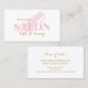 Werben Sie als beruflicher Friseursalon mit dieser eleganten Visitenkarte in Rosa und Gold, mit einer weichen rosa Silhouette einer Frau mit langen, fließenden, wortverstrichenen Bordüren. Personalisieren Sie das durch Hinzufügen des Namens des zertifizierten Kosmetikers oder Haarstylisten.