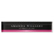 Elegantes Namensschild mit weißem Namen und Titel auf schwarzem Hintergrund über einem rosa Satingradienten.