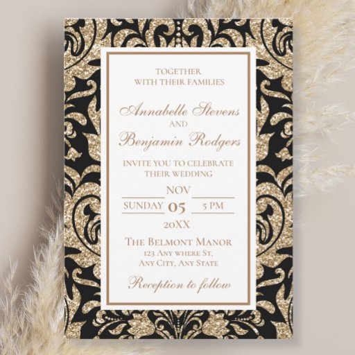 Dieses schöne Design verfügt über einen goldenen Imitat-Glitzer-Damast-Druck mit einem schwarzen Hintergrund, der in die Farbe Ihrer Wahl geändert werden kann. Perfekte Eleganz für jede Hochzeit! Passen Sie es mit all Ihren Details an, damit es Ihnen gehört!
