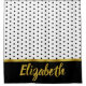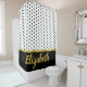 An diesem weißen Duschvorhang sieht man schwarze Polka-Punkte. Ein schwarzes Band ist unten. Auf der schwarzen Band erscheint ein Goldskript für Imitate (nicht für Folien). Sie können das Skript bearbeiten, um den gewünschten Namen oder die personalisierte Nachricht anzuzeigen.