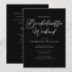 Diese elegante schwarze Einladung zum Junggesellinnen-Wochenende enthält schicke weiße Typografie für eine moderne Braut, die ein exklusives 3-Tage-Event mit ihren Brautjungfern plant. Eine trendige minimalistische Einladung zur Junggesellinnenparty für Ihre besten Freundinnen.