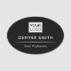 Schwarz, elegant, oval Namensschild mit Ihrem Namen, Titel und eigenem Logo. Ihr Name und Ihr Titel werden durch einen weißen Trenner getrennt. Mit dem Designwerkzeug können Sie Schriftart und Farben ändern, das Logo und andere Elemente verschieben und verändern.